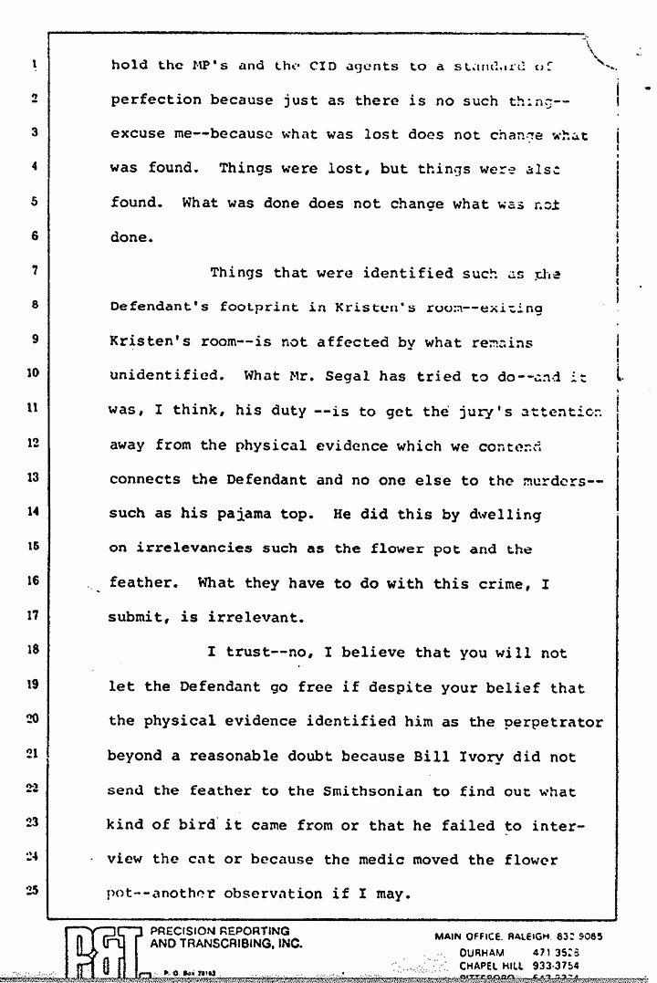 Things that were identified such as the Defendant's footprint in Kristen's room -- exiting Kristen's room -- is not affected by what remains unidentified. What Mr. Segal has tried to do -- and it was, I think, his duty -- is to get the jury's attention away from the physical evidence which we contend connects the Defendant and no one else to the murders -- such as his pajama top. He did this by dwelling on irrelevancies such as the flower pot and the feather. What they have to do with this crime, I submit, is irrelevant.