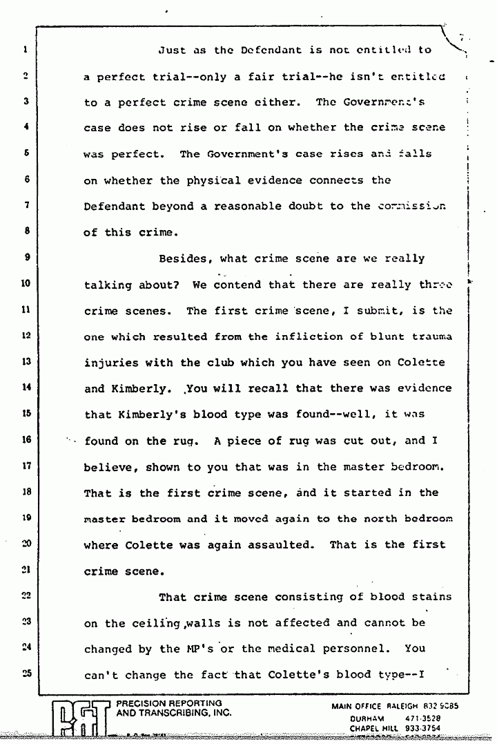 Besides, what crime scene are we really talking about? We contend that there are really three crime scenes. The first crime scene, I submit, is the one which resulted from the infliction of blunt trauma injuries with the club which you have seen on Colette and Kimberly. You will recall that there was evidence that Kimberly's blood type was found -- well, it was found on the rug. A piece of rug was cut out, and I believe, shown to you, that was in the master bedroom. That is the first crime scene, and it started in the master bedroom and it moved again to the north bedroom where Colette was again assaulted. That is the first crime scene.