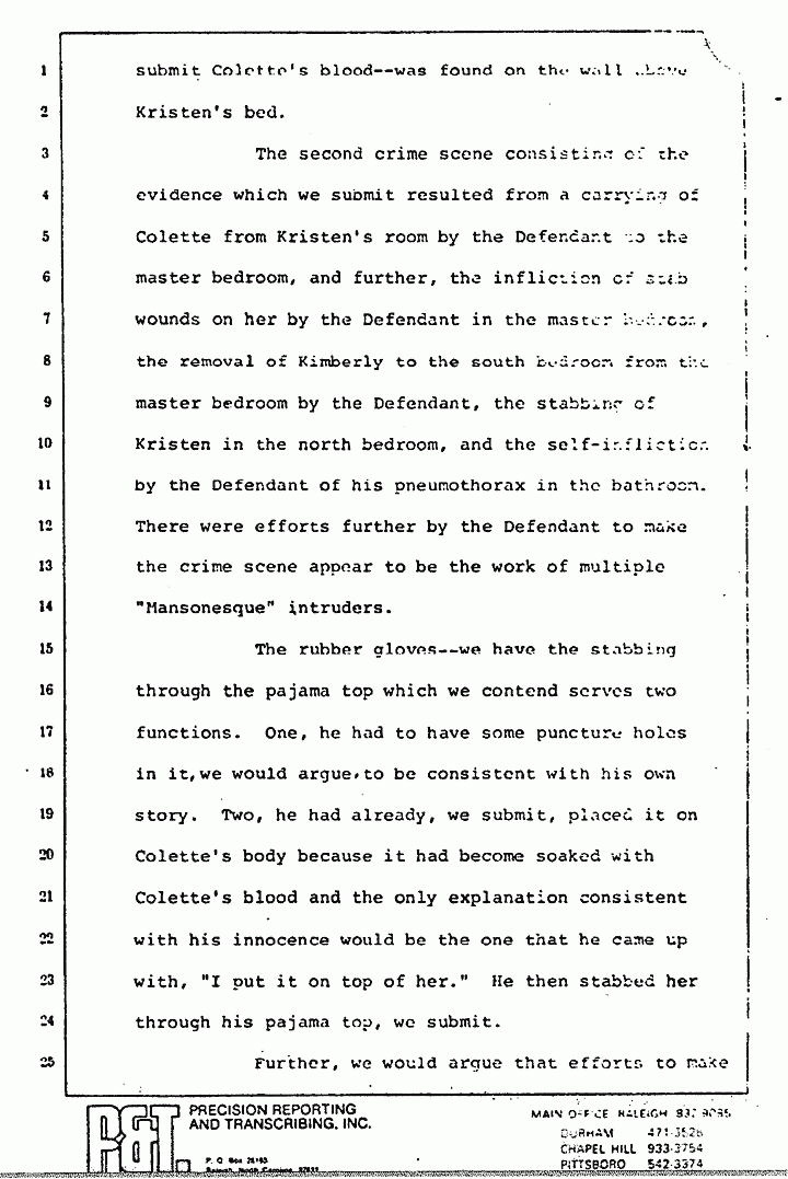 The rubber gloves -- we have the stabbing through the pajama top which we contend serves two functions. One, he had to have some puncture holes in it, we would argue, to be consistent with his own story. Two, he had already, we submit, placed it on Colette's body because it had become soaked with Colette's blood and the only explanation consistent with his innocence would be the one that he came up with, "I put it on top of her." He then stabbed her through his pajama top, we submit.