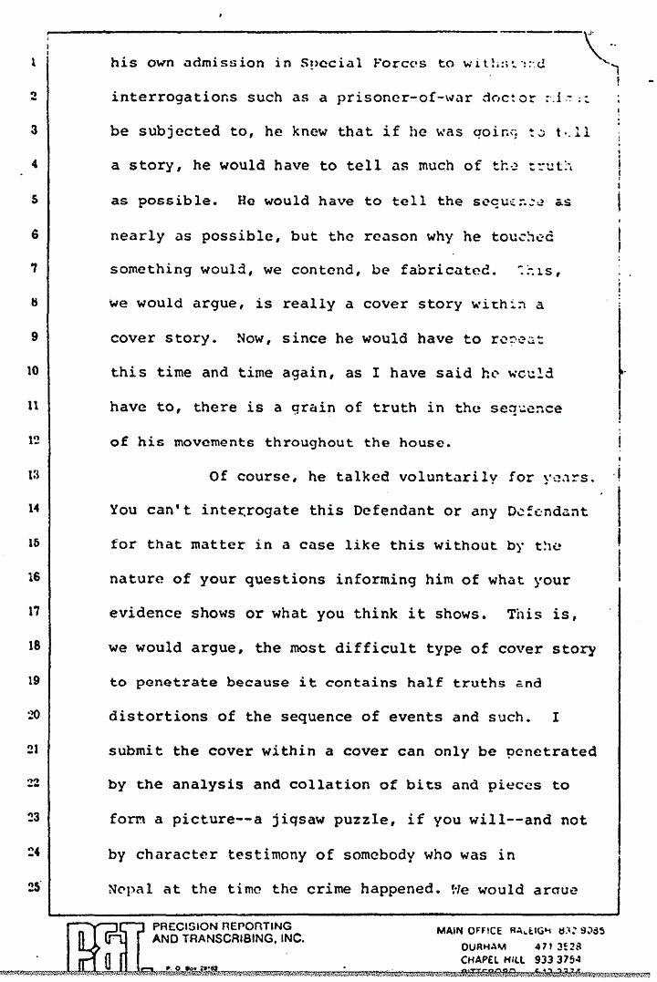 Now, since the Defendant had been trained by his own admission in Special Forces to withstand interrogations such as a prisoner-of-war doctor might be subjected to, he knew that if he was going to tell a story, he would have to tell as much of the truth as possible. He would have to tell the sequence as nearly as possible, but the reason why he touched something would, we contend, be fabricated. This, we would argue, is really a cover story within a cover story. Now, since he would have to repeat this time and time again, as I have said he would have to, there is a grain of truth in the sequence of his movements throughout the house.
