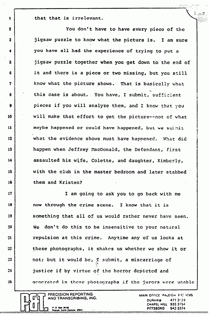 You don't have to have every piece of the jigsaw puzzle to know what the picture is. I am sure you have all had the experience of trying to put a jigsaw puzzle together when you get down to the end of it and there is a piece or two missing, but you still know what the picture shows. That is basically what this case is about. You have, I submit, sufficient pieces if you will analyze them, and I know that you will make that effort to get the picture -- not of what maybe happened or could have happened, but we submit what the evidence shows must have happened. What did happen when Jeffrey MacDonald, the Defendant, first assaulted his wife, Colette, and daughter, Kimberly, with the club in the master bedroom and later stabbed them and Kristen?
