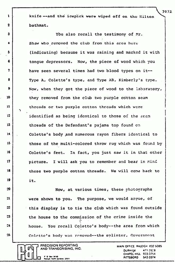 You also recall the testimony of Mr. Shaw who removed the club from this area here (indicating) because it was raining, and marked it with tongue depressors. Now, the piece of wood which you have seen several times had two blood types on it -- Type A, Colette's type, and Type AB, Kimberly's type. Now, when they got the piece of wood to the laboratory, they removed from the club two purple cotton seam threads or two purple cotton threads which were identified as being identical to those of the seam threads of the Defendant's pajama top found on Colette's body, and numerous rayon fibers identical to those of the multi-colored throw rug which was found by Colette's feet. In fact, you just saw it in that other picture. I will ask you to remember and bear in mind these two purple cotton threads. We will come back to it.