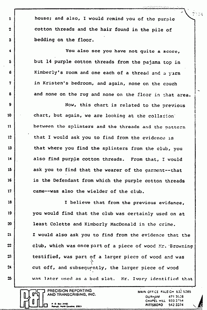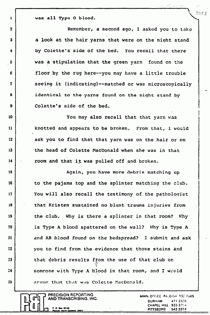 Again, you have more debris matching up to the pajama top and the splinter matching the club. You will also recall the testimony of the pathologist that Kristen sustained no blunt trauma injuries from the club. Why is there a splinter in that room? Why is Type A blood spattered on the wall? Why is Type A and AB blood found on the bedspread? I submit and ask you to find from the evidence that those stains and that debris results from the use of that club on someone with Type A blood in that room, and I would argue that that was Colette MacDonald.