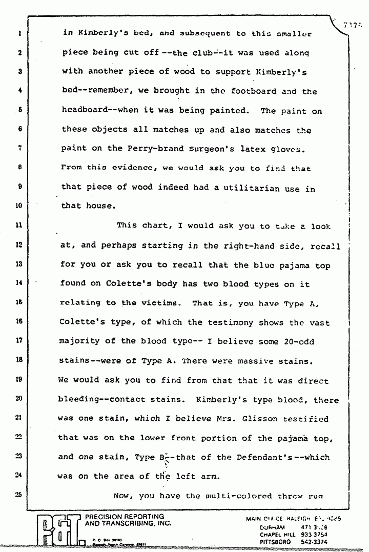 You will recall that we asked you to find that Colette was injured in the north bedroom. You have her blood type on the wall where there were spatters on two areas. You have her blood -- remember in Mrs. Glisson's testimony about the large stains on the top sheet in Kristen's bed -- which I would submit indicate direct bleeding. She held them up and they were quite significant in size. You also have Kimberly's type -- I am sorry -- Kimberly's type blood is on the bedspread. You have got the blood on the floor right here (indicating). The testimony about that was that it was all Type O blood.