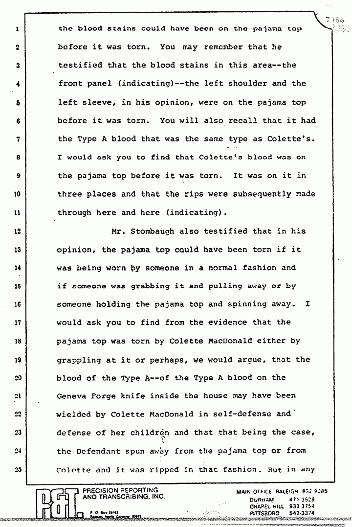 Mr. Stombaugh also testified that in his opinion, the pajama top could have been torn if it was being worn by someone in a normal fashion and if someone was grabbing it and pulling away, or by someone holding the pajama top and spinning away. I would ask you to find from the evidence that the pajama top was torn by Colette MacDonald either by grappling at it or perhaps, we would argue, that the blood of the Type A -- of the Type A blood on the Geneva Forge knife inside the house may have been wielded by Colette MacDonald in self-defense and defense of her children, and that that being the case, the Defendant spun away from the pajama top or from Colette and it was ripped in that fashion. But in any event, when it was ripped, I would ask you to find seam threads dropped out.