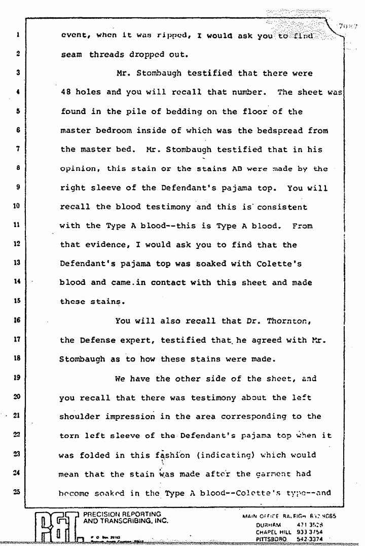 Mr. Stombaugh testified that there were 48 holes and you will recall that number. The sheet was found in the pile of bedding on the floor of the master bedroom, inside of which was the bedspread from the master bed. Mr. Stombaugh testified that in his opinion, this stain or the stains AB were made by the right sleeve of the Defendant's pajama top. You will recall the blood testimony and this is consistent with the Type A blood -- this is Type A blood. From that evidence, I would ask you to find that the Defendant's pajama top was soaked with Colette's blood and came in contact with this sheet and made these stains.