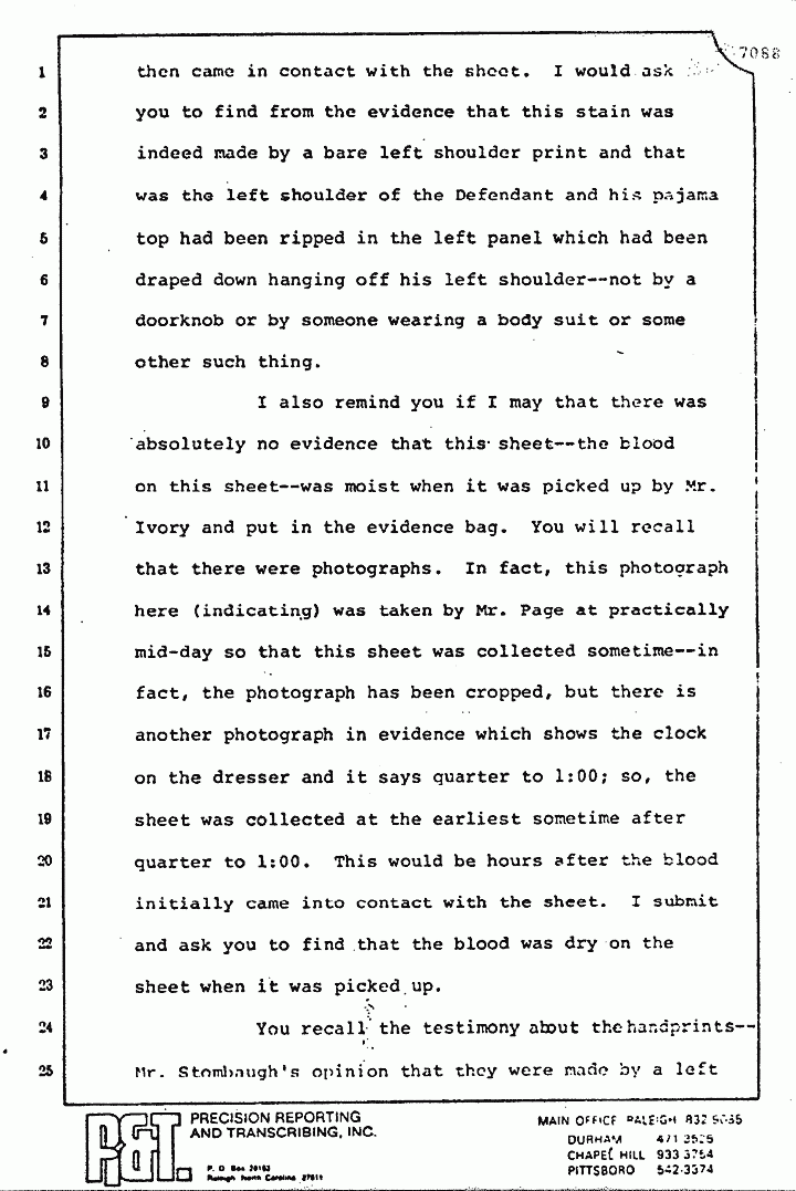 I also remind you, if I may, that there was absolutely no evidence that this sheet -- the blood on this sheet -- was moist when it was picked up by Mr. Ivory and put in the evidence bag. You will recall that there were photographs. In fact, this photograph here (indicating) was taken by Mr. Page at practically mid-day so that this sheet was collected sometime -- in fact, the photograph has been cropped, but there is another photograph in evidence which shows the clock on the dresser and it says quarter to 1:00; so, the sheet was collected, at the earliest, sometime after quarter to 1:00. This would be hours after the blood initially came into contact with the sheet. I submit and ask you to find that the blood was dry on the sheet when it was picked up.