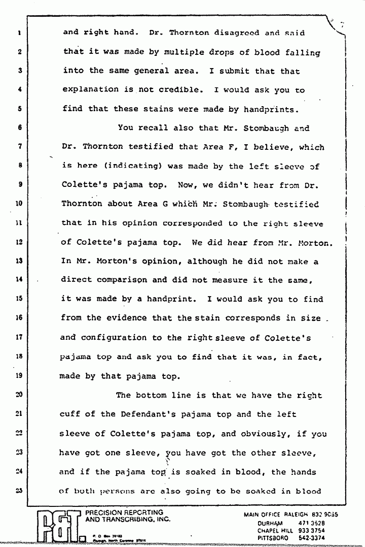 You recall also that Mr. Stombaugh and Dr. Thornton testified that Area F, I believe, which is here (indicating) was made by the left sleeve of Colette's pajama top. Now, we didn't hear from Dr. Thornton about Area G which Mr. Stombaugh testified that in his opinion corresponded to the right sleeve of Colette's pajama top. We did hear from Mr. Morton. In Mr. Morton's opinion, although he did not make a direct comparison and did not measure it the same, it was made by a handprint. I would ask you to find from the evidence that the stain corresponds in size and configuration to the right sleeve of Colette's pajama top and ask you to find that it was, in fact, made by that pajama top.