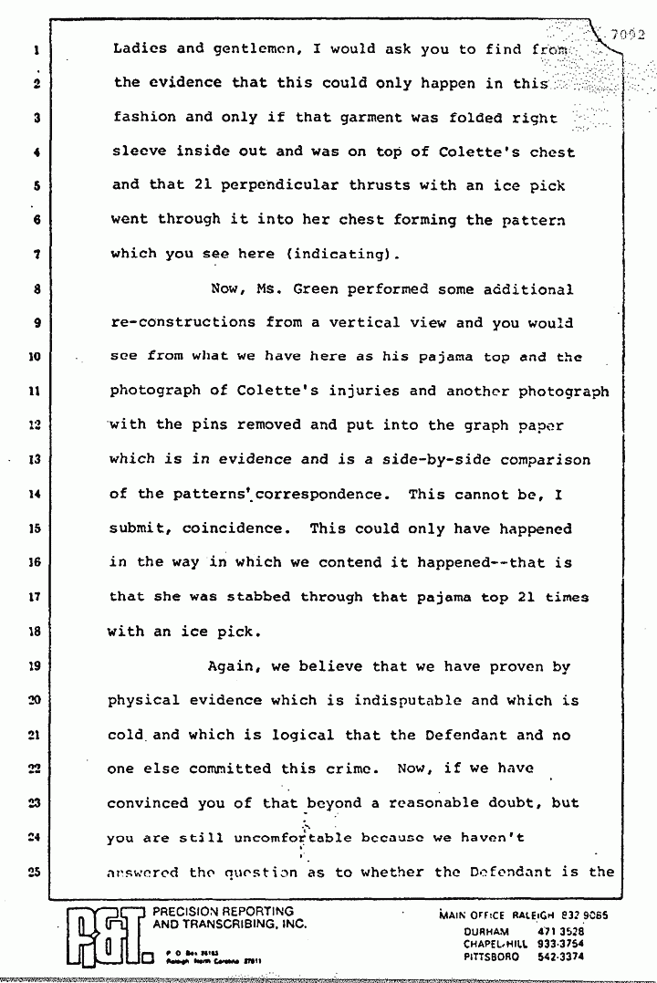 Now, you also remember Ms. Green who was subjected to a rather lengthy cross-examination and who testified as to how she did with the reconstruction. Ladies and gentlemen, I would ask you to find from the evidence that this could only happen in this fashion, and only if that garment was folded right sleeve inside out and was on top of Colette's chest, and that 21 perpendicular thrusts with an ice pick went through it into her chest, forming the pattern which you see here (indicating).